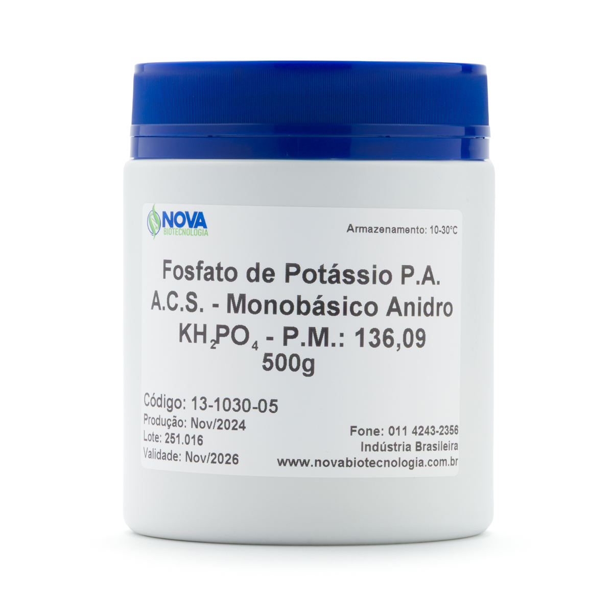 O Fosfato de Potássio é um reagente com elevada capacidade tamponante. Ocorre em várias formas: monobásico, dibásico, tribásico e (K3PO4). Apresentação 500g